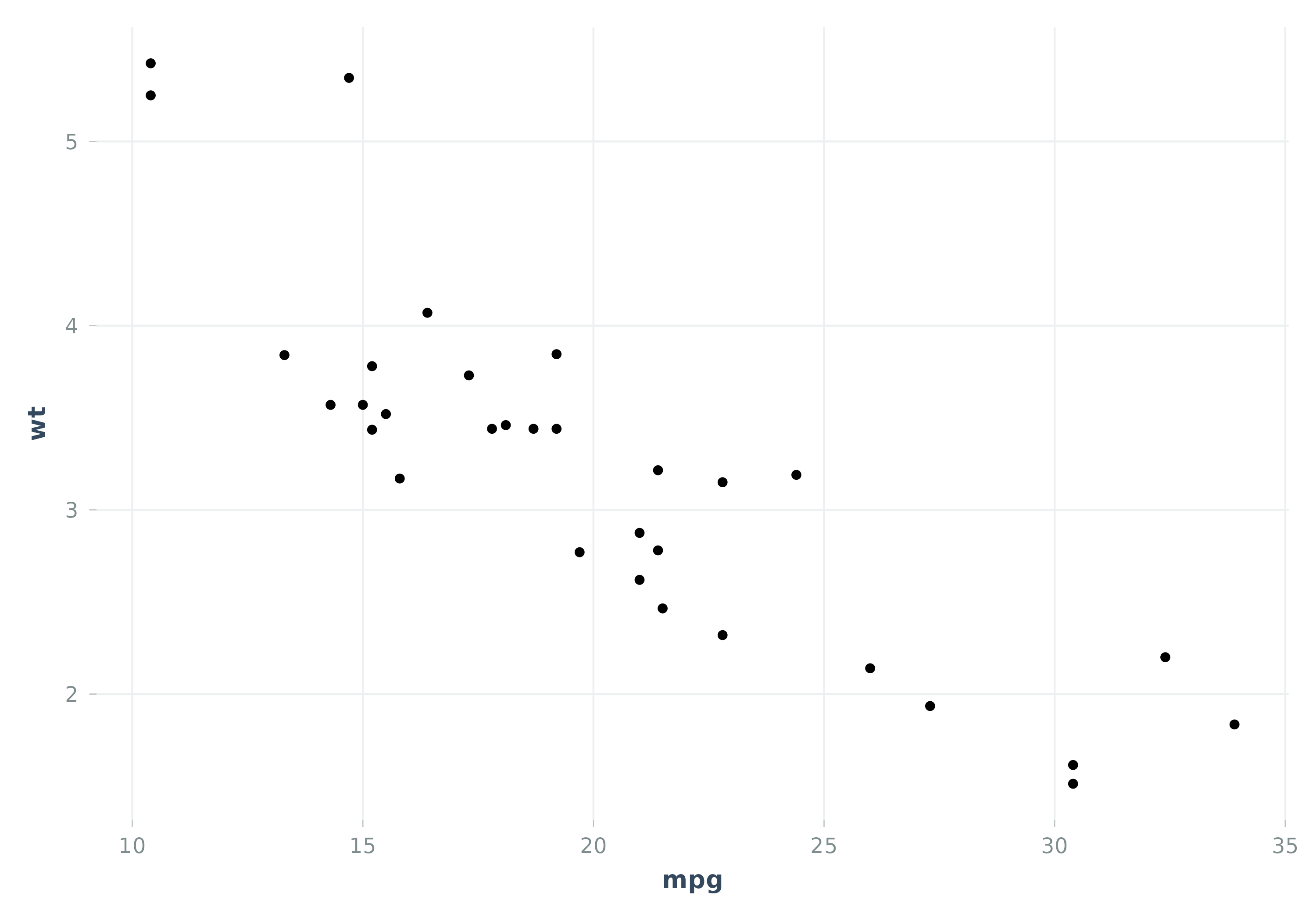 ggplot2::ggplot(mtcars, ggplot2::aes(mpg, wt)) +