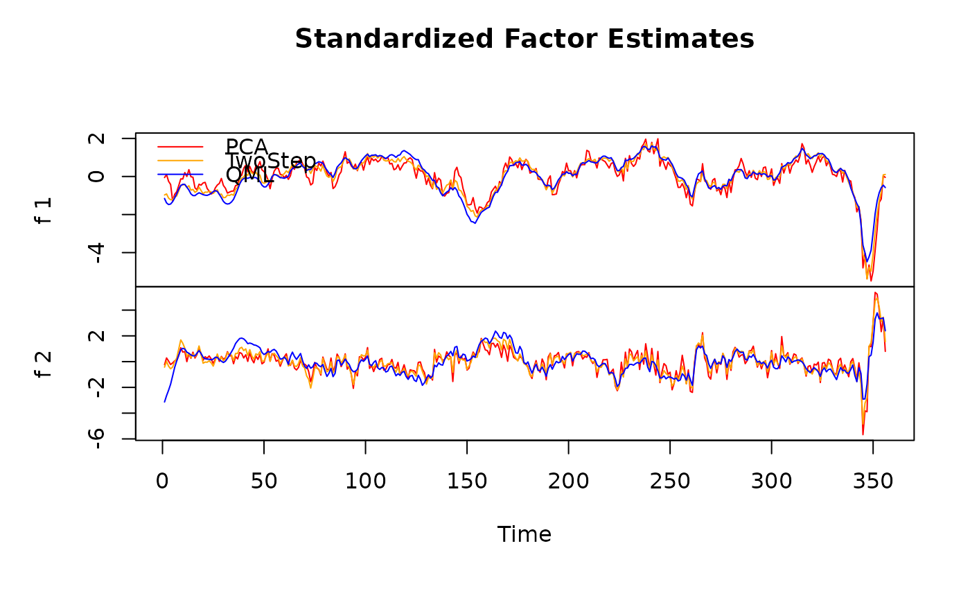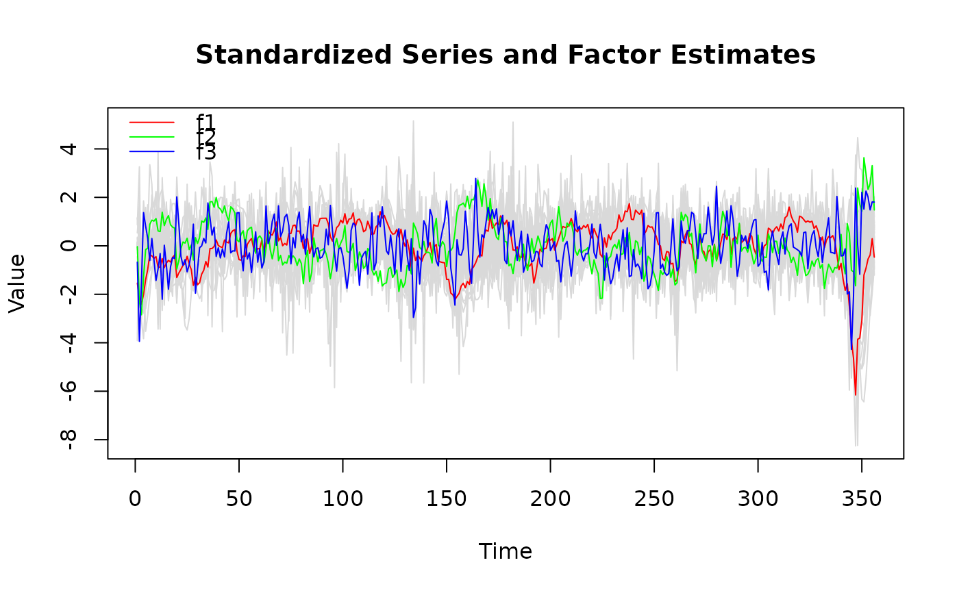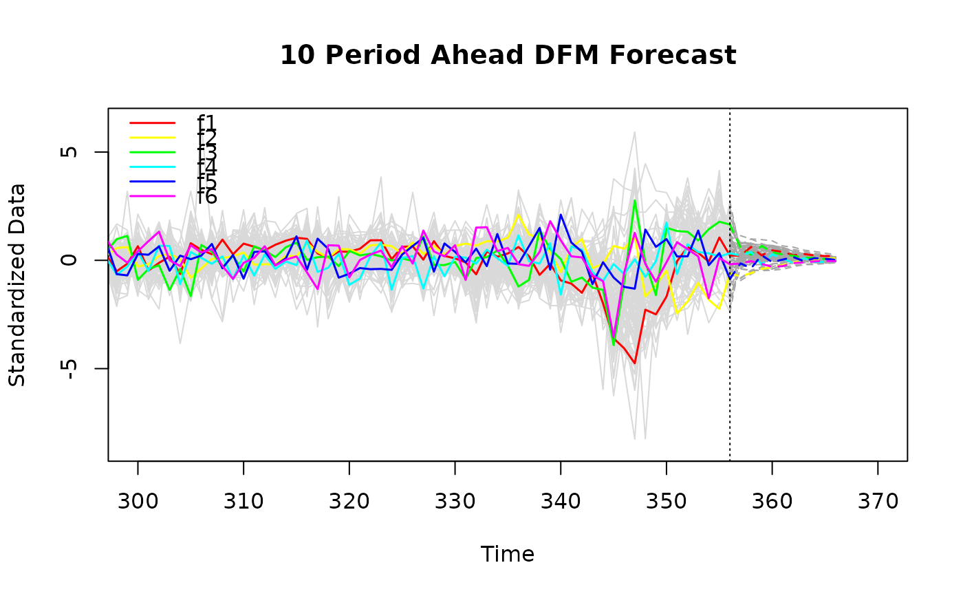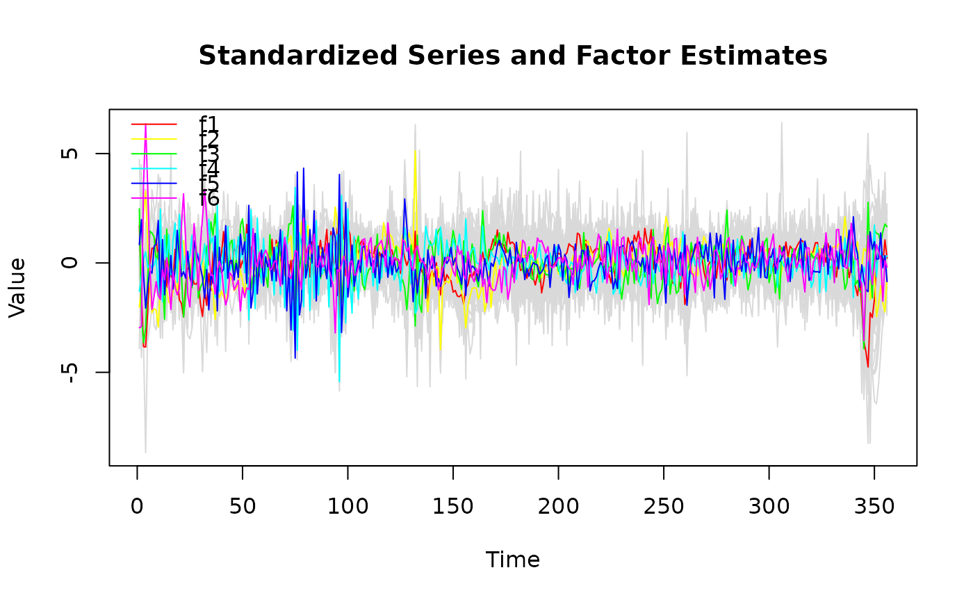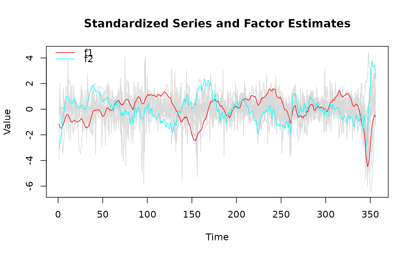Factors are allowed to evolve in a \(VAR(p)\) process, and data is internally standardized (scaled and centered) before estimation (removing the need of intercept terms). By assumptions 1-4, this translates into the following dynamic form: