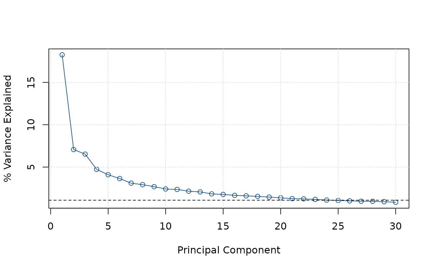 In the Screeplot a horizontal dashed line is shown signifying an eigenvalue of 1, or a share of variance corresponding to 1 divided by the number of eigenvalues.