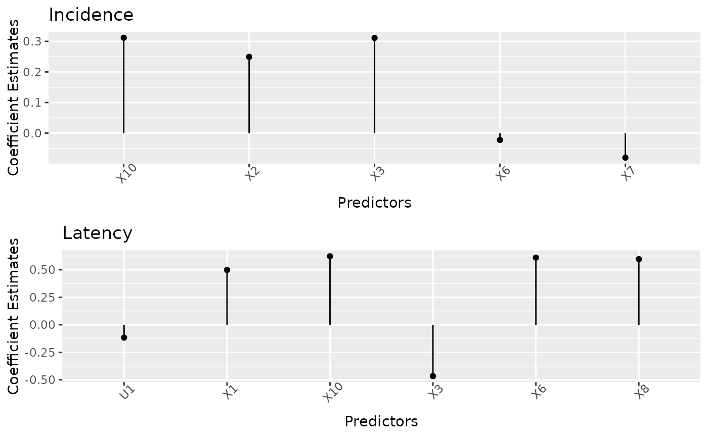 Often, we want to estimate the effect of covariates on overall outcome and because different covariates may affect incidence versus latency portions of the MCM, we let represent the incidence covariates and represent the latency covariates, where and may or may not differ. The mixture cure survival function is given by Here, represents the probability of being susceptible, represents the probability of being cured, and represents the survival function (or latency) for those susceptible. Thus, the mixture cure model structure allows one to investigate the effect of covariates on two components of the model: incidence (susceptible versus cured) and latency (time-to-event for susceptibles). The incidence component is ordinarily modeled using logistic regression and we have parameters and vector of coefficients . The latency or time-to-event function for susceptibles can be modeled in different ways, using for example a parametric, a non-parametric, or semi-parametric survival model. Therefore, the vector of coefficients in the latency portion of the model may be accompanied by a shape and scale parameters if a Weibull or exponential model are fit.