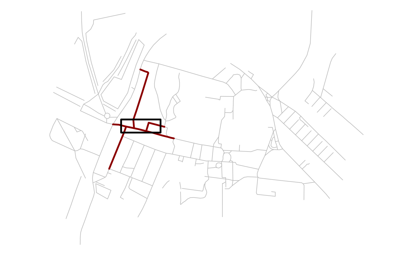 The following map represent the result, where we highlight the bounding circle and the road segments within using a dark-red colour, while all the other road segments are coloured in grey.