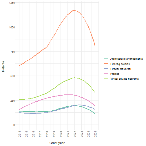 filter(cpc_group != "H04L63:02") %>% # remove patents categorized into only top-level category of H04L63/02
