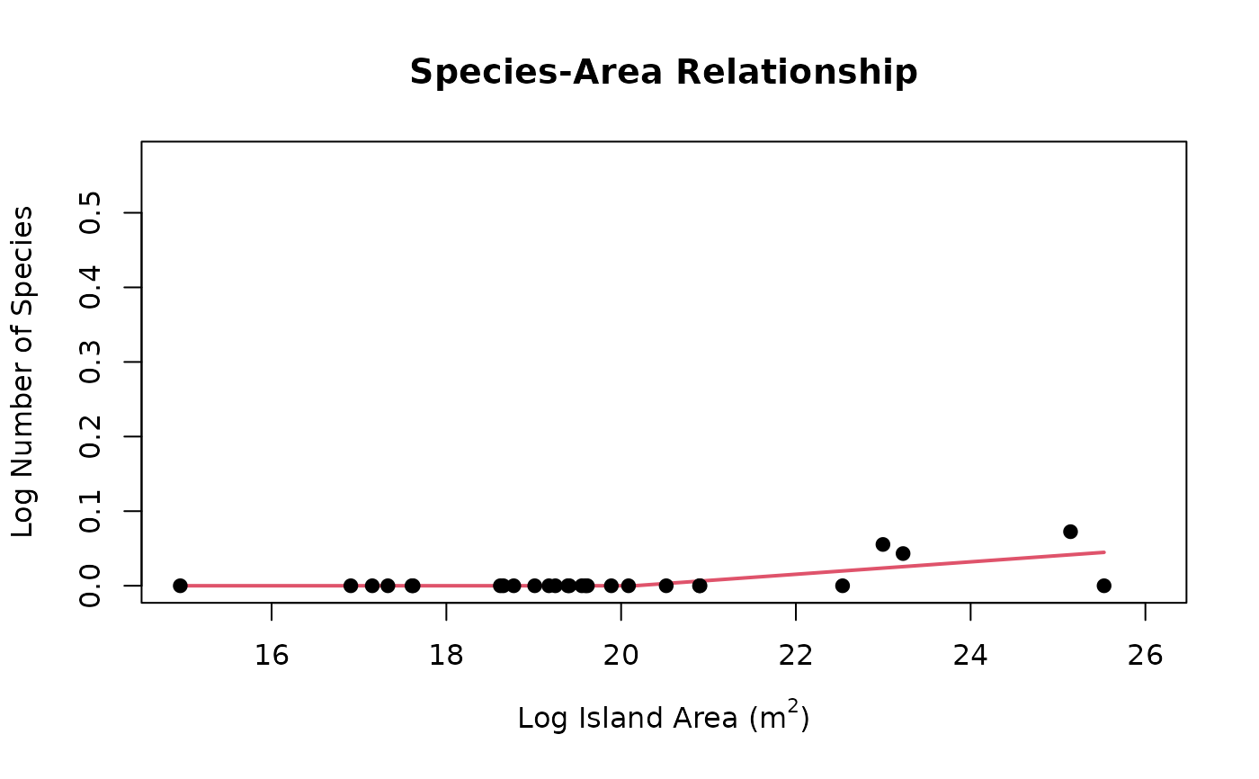 Use segmented regression to create a speciation-area relationship plot. The X axis represents log(island area) and the Y axis represents log(speciation rate)