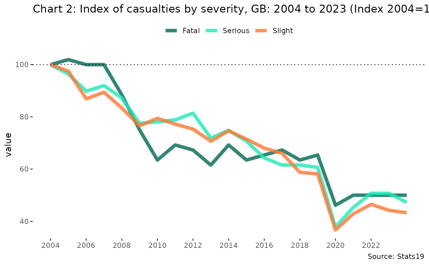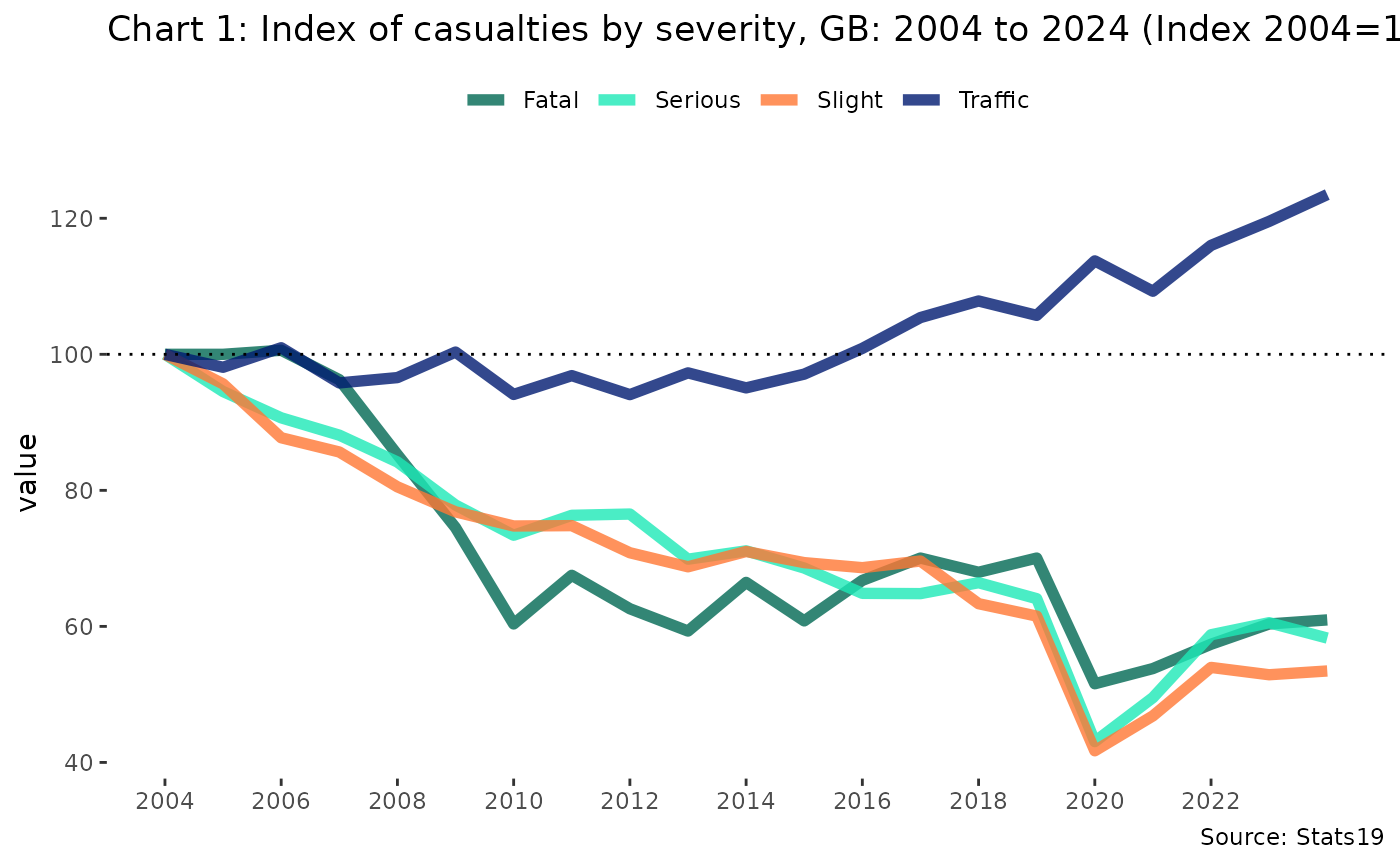 Table 1 and Chart 1 show that pedestrian traffic (measured by distance walked) has increased between 2004 and 2024 whilst fatalities, serious and slight injuries have fallen.