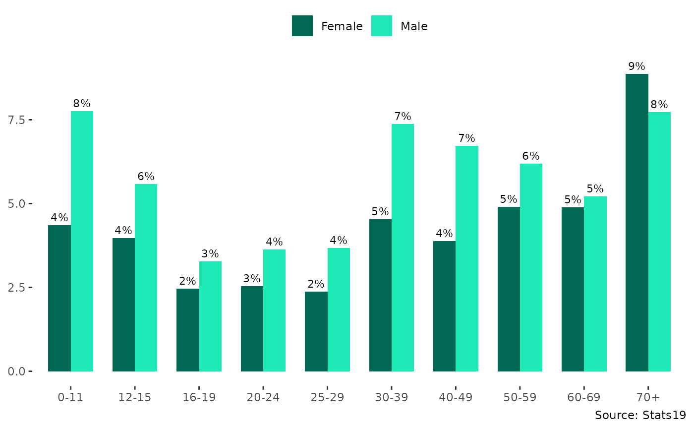 There are 1.3 times more male than female pedestrian casualties overall. This compares to 1.6 more for 30-39, 1.8 more for 0-11and 0.9 more for 70+ - the only age group in which female casualties outnumber males.