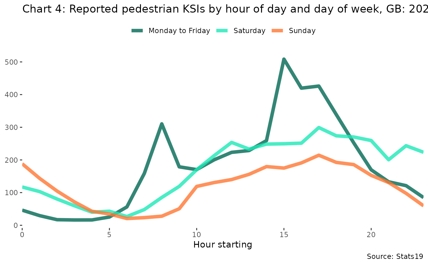 The weekday peak time for pedestrian KSIs is from 3pm to 6pm. By contrast, the peak is from 4pm to 7pm at weekends.