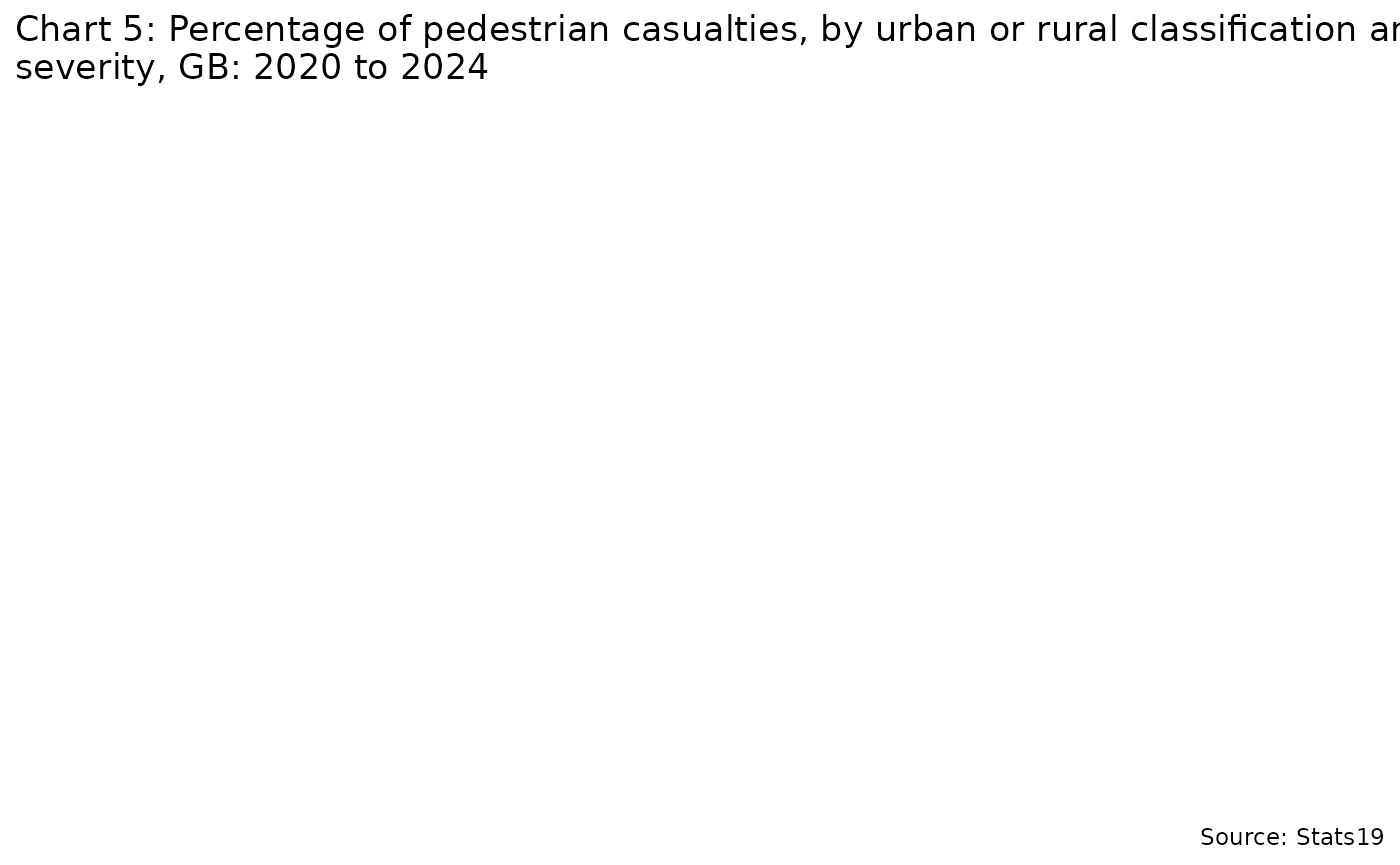 Chart 5 shows that between 2020 and 2024, % of pedestrian fatalities occurred on urban roads compared to % of all pedestrian casualties. % of pedestrian fatalities occurred on motorways. This would be people outside their vehicles whether they are moving at the time or not.
