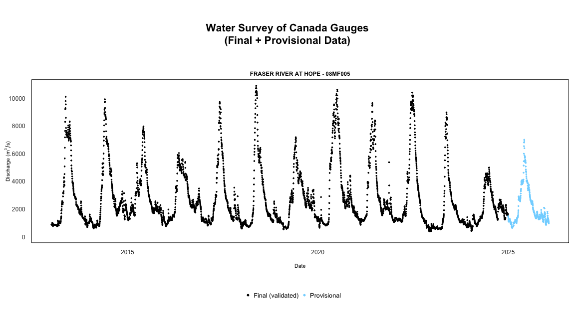 #> # ℹ 2 more variables: provisional_end <date>, provisional_n <int>Note that provisional data is aggregated to daily means to match the daily format of HYDAT data. For non-aggregated real-time data at sub-daily intervals, use realtime_ws() directly.